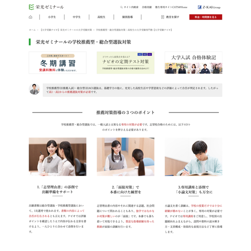 お子様の能力に合わせて最適な志望校を一緒に選んだり、定期テスト対策を行ったりできるのも特徴です。 一般入試に切り替える場合は、切り替え時のサポートも行っています。 合格保証制度や返金制度も設けられており、安心して通える点も人気の理由です。